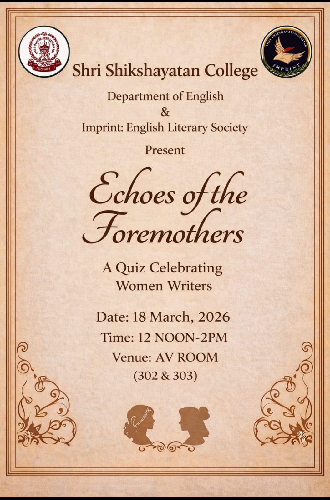 QUIZ COMPETITION TITLED: “ECHOES OF THE FOREMOTHERS: A QUIZ CELEBRATING WOMEN WRITERS” – DEPARTMENT OF ENGLISH & IMPRINT: ENGLISH LITERARY SOCIETY – Shri Shikshayatan College