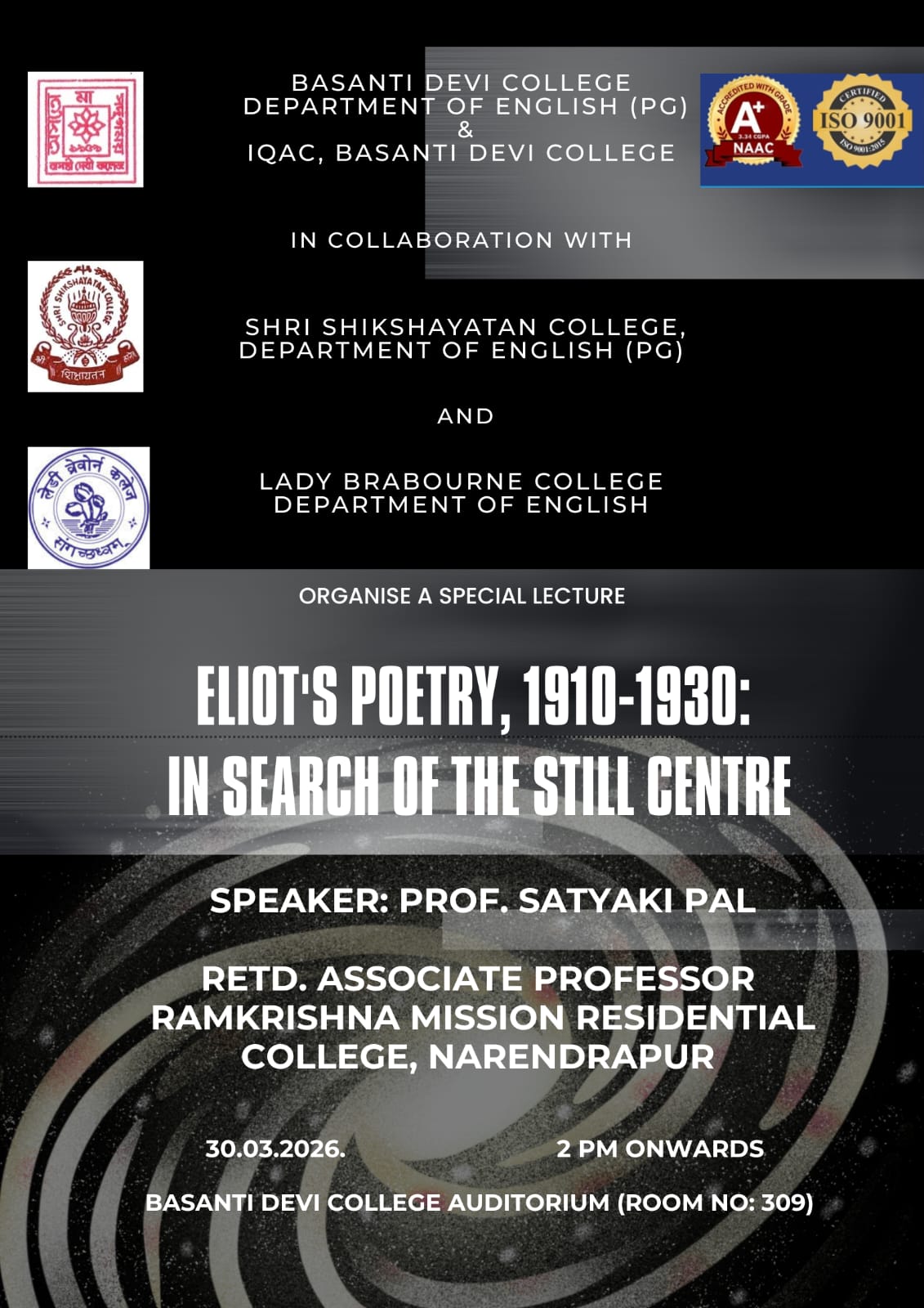SPECIAL LECTURE ORGANISED BY THE DEPARTMENT OF ENGLISH (P.G. SECTION), BASANTI DEVI COLLEGE, IN COLLABORATION WITH THE DEPARTMENTS OF ENGLISH (P.G.), SHRI SHIKSHAYATAN COLLEGE AND LADY BRABOURNE COLLEGE – Shri Shikshayatan College